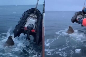 El impactante momento en el que una morsa clava sus colmillos en una lancha inflable