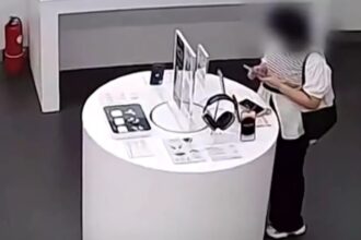 Robó un teléfono en una tienda mordiendo el cable de seguridad, todo quedó grabado