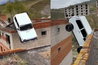 EN VIDEO | No era su día de muerte: Intentó cruzar de un edificio a otro con su carro y todo salió mal, cayó desde 15 metros