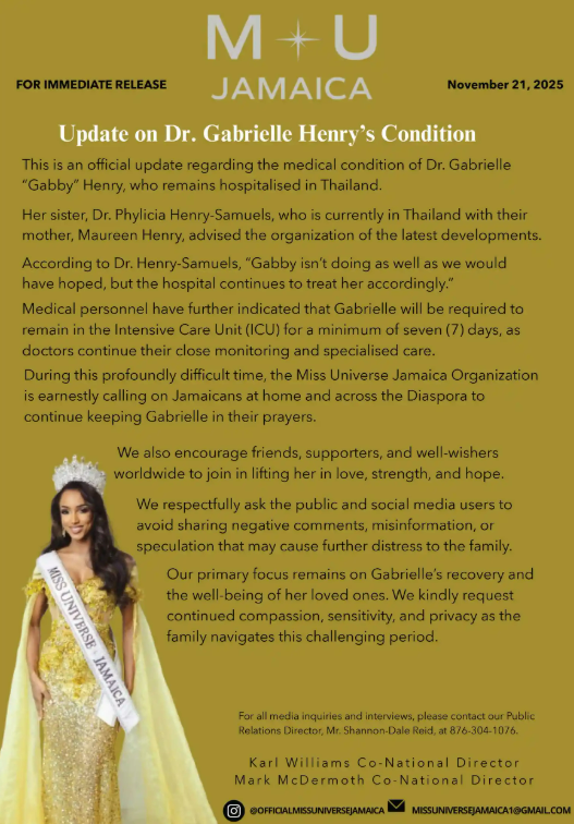«Su hermana, la Dra. Phylicia Henry-Samuels, quien se encuentra actualmente en Tailandia con su madre, Maureen Henry, informó a la organización sobre los últimos acontecimientos. Según la Dra. Henry-Samuels: Gabby no se encuentra tan bien como esperábamos, pero el hospital continúa brindándole el tratamiento adecuado», se lee en el comunicado de la organización jamaicana.