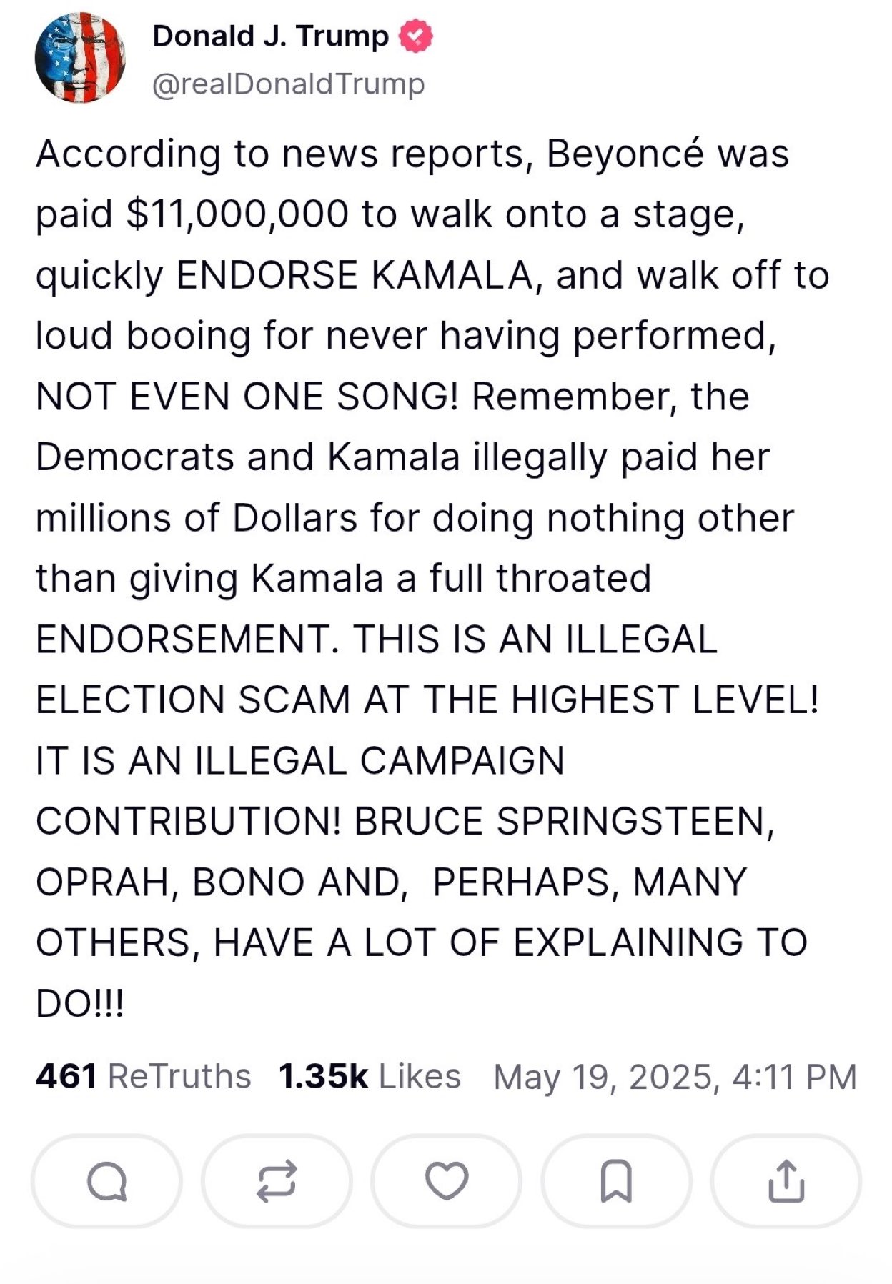 Por lo cual, Trump también señaló que «Bruce Springsteen, Oprah, Bono y, quizás, muchos otros, tienen mucho que explicar».