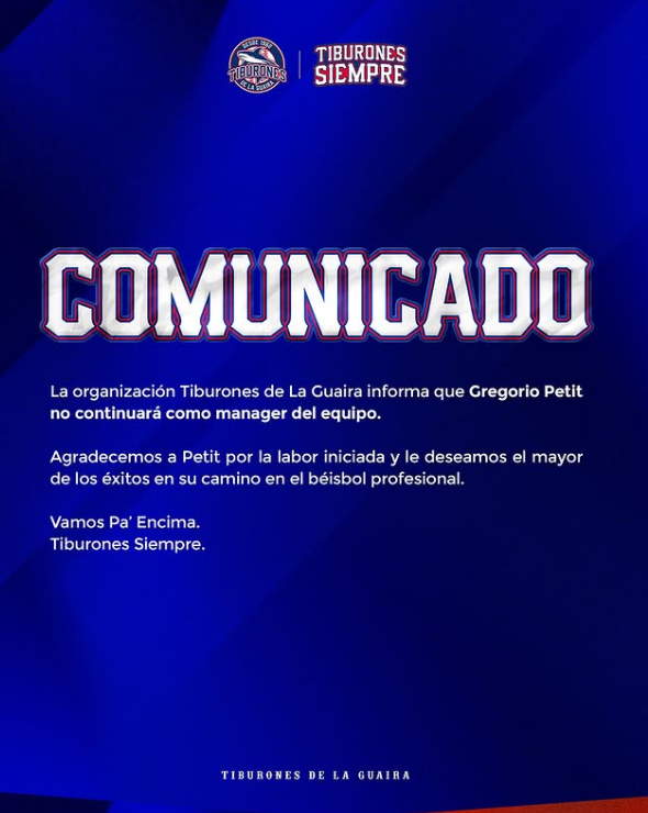 En ese sentido, la directiva del equipo le agradeció a Petit «por la labor iniciada y le deseamos el mayor de los éxitos en su camino en el béisbol profesional».