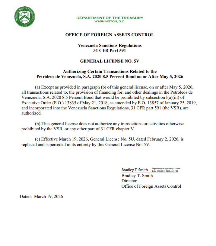 El Departamento del Tesoro de Estados Unidos emitió este jueves, 19 de marzo, la Licencia General No. 5V, una nueva prórroga que extiende hasta mayo la protección de Citgo frente a los acreedores del bono Pdvsa 2020.