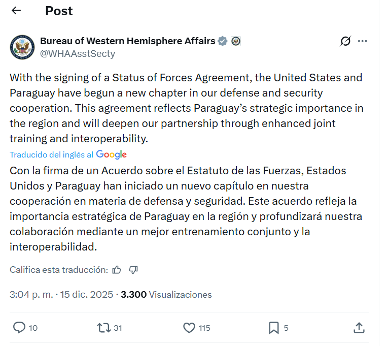 “Este histórico acuerdo establece un marco claro para la presencia y las actividades del personal militar estadounidense y civil del Departamento de Guerra en Paraguay, facilitando la capacitación bilateral y multinacional, la asistencia humanitaria, la respuesta ante desastres y otros intereses de seguridad compartidos”, sostiene el comunicado oficial emitido por la Secretaría de Estado.
