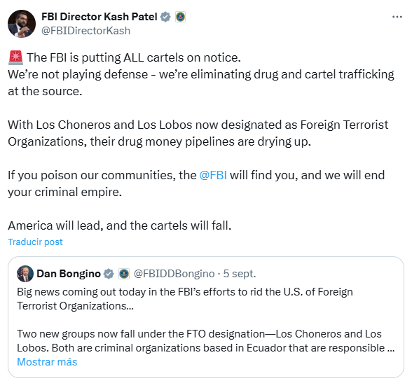 «El FBI está poniendo a TODOS los cárteles en aviso. No estamos jugando a la defensiva: estamos eliminando el tráfico de drogas y de los cárteles desde la fuente. Ahora que Los Choneros y Los Lobos han sido designados como Organizaciones Terroristas Extranjeras, sus canales de distribución de dinero del narcotráfico se están agotando», dijo con respecto a ambos grupos provenientes de Ecuador.