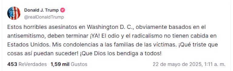 Desde la plataforma Truth Social, el presidente de Estados Unidos, Donald Trump, también rechazó lo ocurrido. “Estos horribles asesinatos en Washington DC, obviamente basados en el antisemitismo, deben terminar ¡YA! El odio y el radicalismo no tienen cabida en Estados Unidos. Mis condolencias a las familias de las víctimas. ¡Qué triste que cosas así puedan suceder! ¡Que Dios los bendiga a todos!”, expresó.