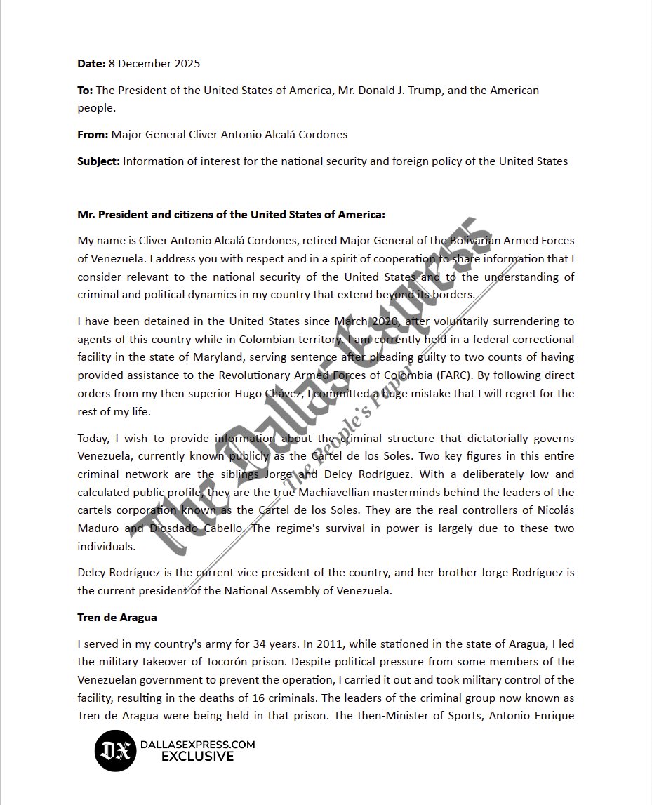 El general venezolano Clíver Alcalá, quien se encuentra privado de libertad en Estados Unidos, envió una carta al presidente Donald Trump, donde señala a los hermanos Delcy y Jorge Rodríguez de ser «el verdadero núcleo de poder del Cártel de los Soles».