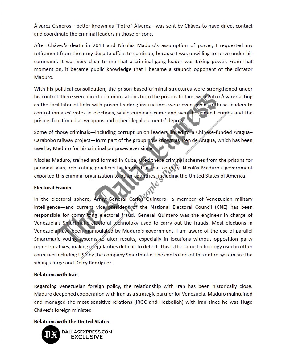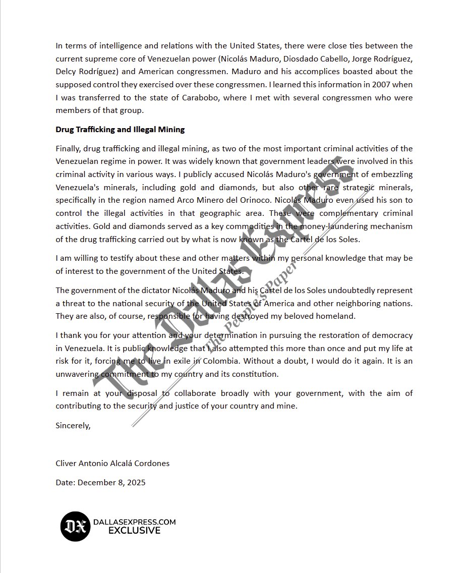 «Dos personas fundamentales en todo este entramado delictivo son los hermanos Jorge y Delcy Rodríguez. De visibilidad menor y calculada, son los verdaderos cerebros maquiavélicos detrás de los jefes de la corporación de carteles conocida como Cártel de los Soles», afirmó en la carta enviada a la Casa Blanca a la que tuvo acceso el medio español ABC y The Dallas Express.