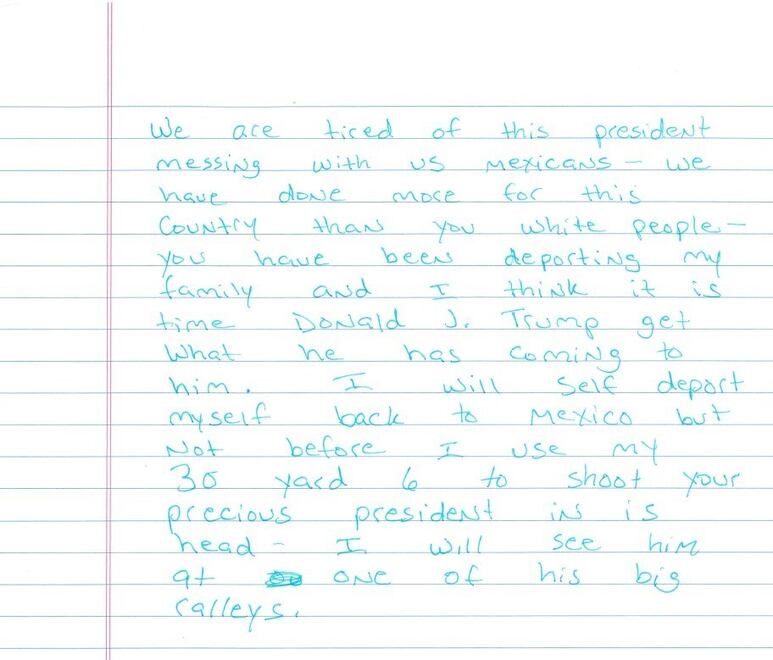 “Me autodeportaré de regreso a México, pero no sin antes usar mi rifle calibre 6 de 30 yardas para dispararle a su querido presidente en la cabeza. Lo veré en uno de sus grandes mítines”, se lee en otra parte de la carta.