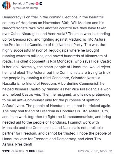 «¡Las elecciones presidenciales en Honduras son el 30 de noviembre! Tito Asfura, del Partido Nacional, es un gran candidato y un exitoso alcalde de Tegucigalpa. Su principal oponente es Rixi Moncada, una comunista radical que está respaldada por Xiomara Castro, quien anteriormente se postuló como comunista, y por Salvador Nasralla, quien también se postuló para presidente y ahora apoya a Moncada. ¡No se puede confiar en ninguno de ellos», escribió Trump.