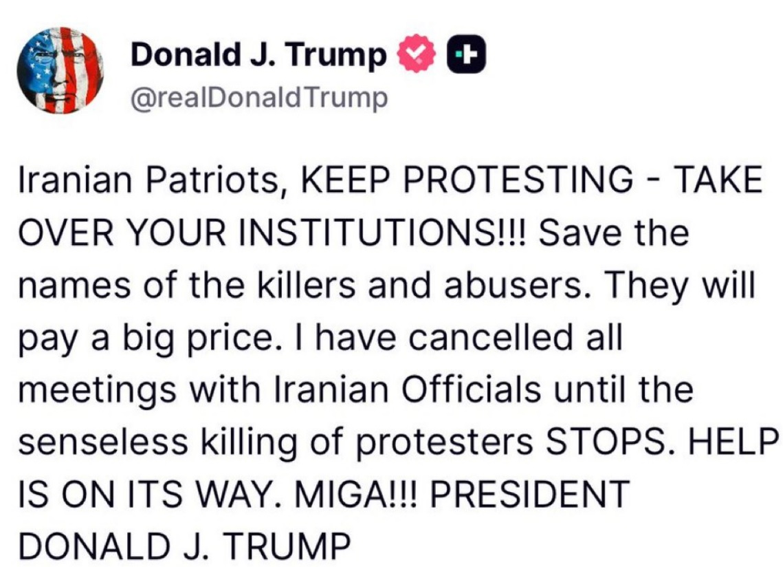 «Patriotas iraníes, ¡sigan protestando, tomen el control de sus instituciones! Guarden los nombres de los asesinos y abusadores. Pagarán un alto precio. He cancelado todas las reuniones con funcionarios iraníes hasta que cesen las matanzas sin sentido de manifestantes. ¡La ayuda está en camino!», escribió el presidente republicano.