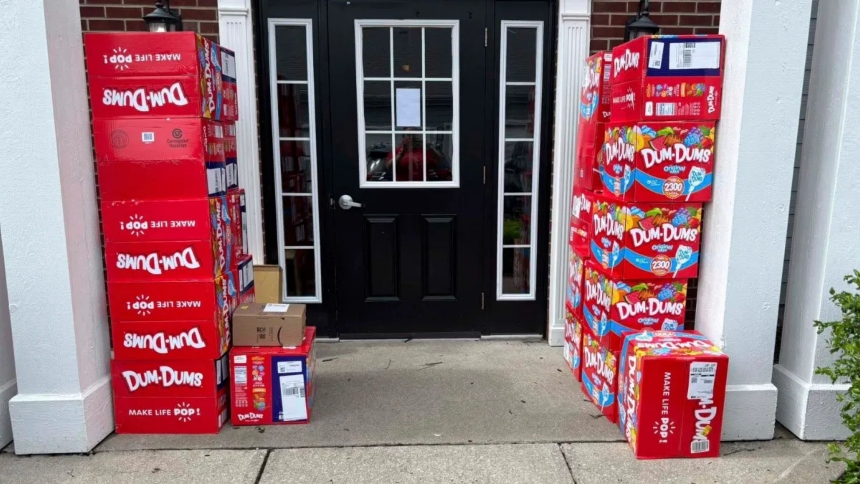 En un insólito incidente ocurrido en Lexington, Kentucky (EEUU), una madre se llevó una gran sorpresa cuando encontró 22 cajas llenas de piruletas Dum-Dum en la puerta de su casa.