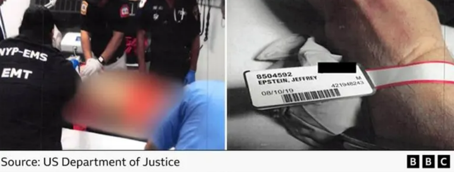 Varias fotos muestran a Epstein acostado en una camilla mientras los médicos intentan reanimarlo. / Cortesía: Departamento de Justicia – BBC