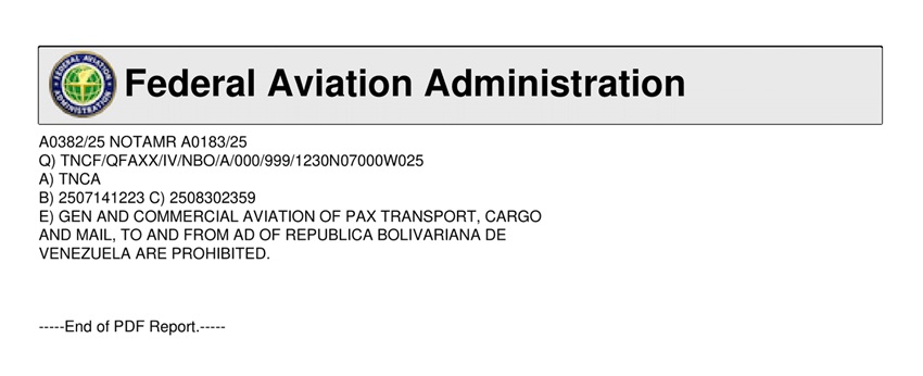 «Aviación comercial de transporte de pasajeros, carga y correo desde y hacia Venezuela están prohibidas», reza el texto.