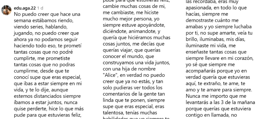 El joven no dudó en recordar las promesas que se hicieron durante su relación. «Siempre íbamos a estar juntos, nunca quise perderte, hice lo que más pude para que estuvieras feliz, cambie muchas cosas de mí, me cambiaste, me hiciste mucho mejor persona», agregó.