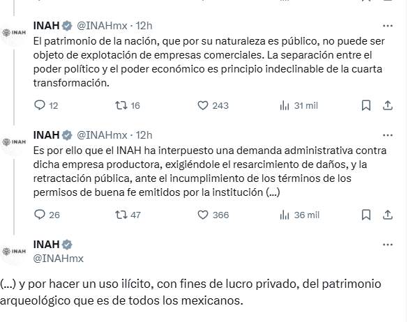 «Es por ello que el INAH ha interpuesto una demanda administrativa contra dicha empresa productora. Se exige el resarcimiento de daños, y la retractación pública, ante el incumplimiento de los términos de los permisos de buena fe emitidos por la institución. Y por hacer un uso ilícito, con fines de lucro privado, del patrimonio arqueológico que es de todos los mexicanos», señaló.