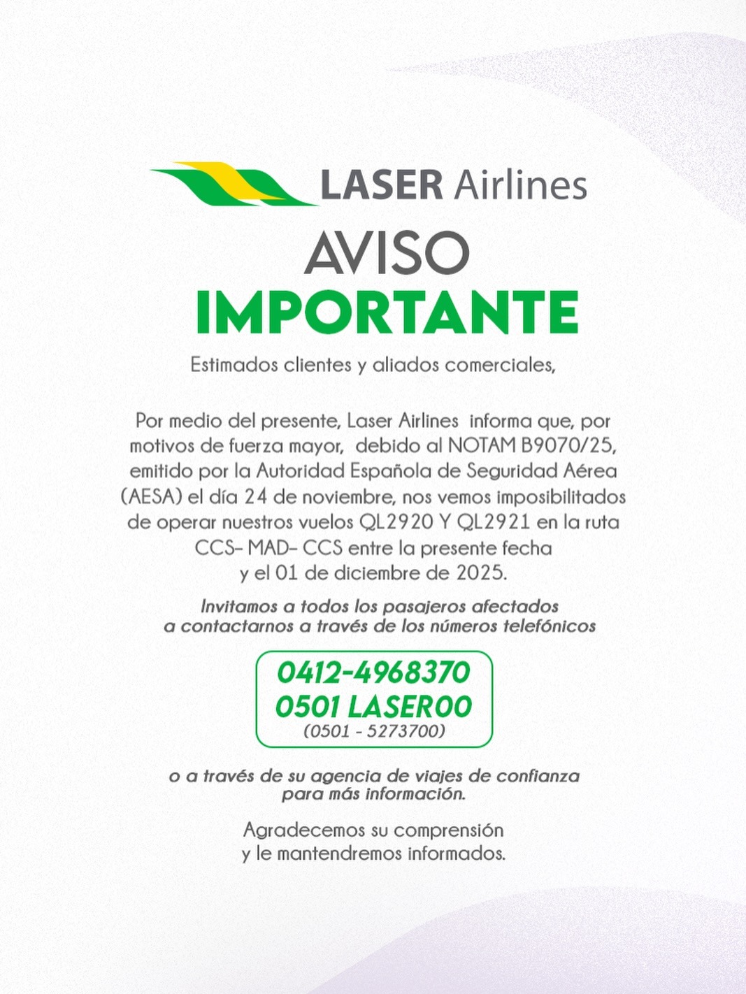 «Por medio del presente, Laser Airlines informa que, por motivos de fuerza mayor, debido al NOTAM B9070/25, emitido por la Autoridad Española de Seguridad Aérea (AESA) el día 24 de noviembre, nos vemos imposibilitados de operar nuestros vuelos QL2920 Y QL2921 en la ruta CCS-MAD-CCS entre la presente fecha y el 01 de diciembre de 2025», indicó la compañía en un comunicado.