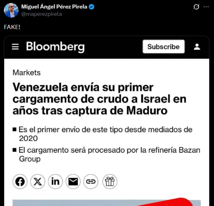 Sin embargo, Pérez Pirela compartió una captura de pantalla de la noticia y se limitó a afirmar que era «fake». Ningún otro vocero gubernamental se ha pronunciado sobre esta supuesta operación de petróleo.