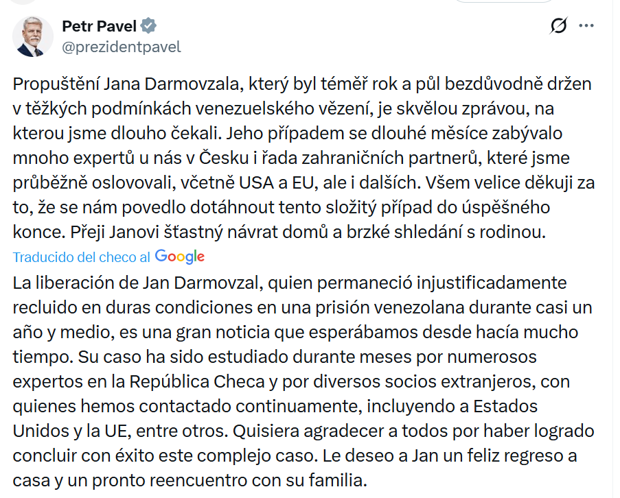“La liberación de Jan Darmovzal, que permaneció injustificadamente recluido en duras condiciones en una prisión venezolana durante casi año y medio, es una gran noticia que esperábamos desde hacía mucho tiempo. Su caso ha sido estudiado durante meses por numerosos expertos en la República Checa y por diversos socios extranjeros, con quienes hemos contactado continuamente, incluyendo a Estados Unidos y la UE, entre otros”, escribió desde Ucrania el presidente checo, Petr Pavel.