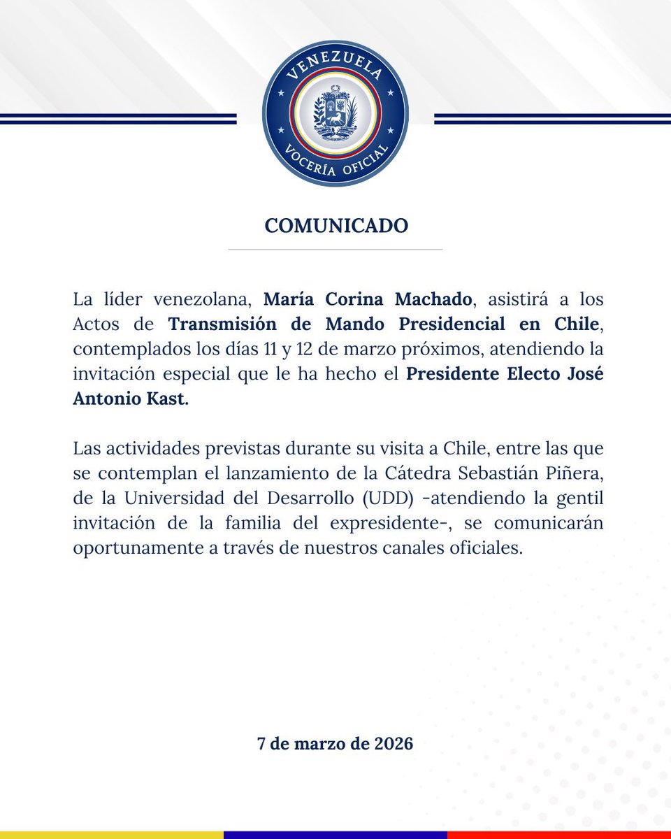 Las otras actividades de Machado en Chile se «comunicarán oportunamente» a través de los canales oficiales, concluyó el comunicado.