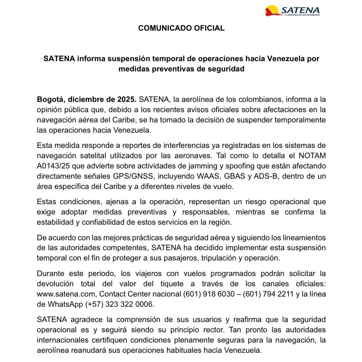 La aerolínea publicó un comunicado en el que aclaró que la suspensión de vuelos es temporal. «Esta medida responde a reportes de interferencias ya registradas en los sistemas de navegación satelital utilizados por las aeronaves», dijo Satena.