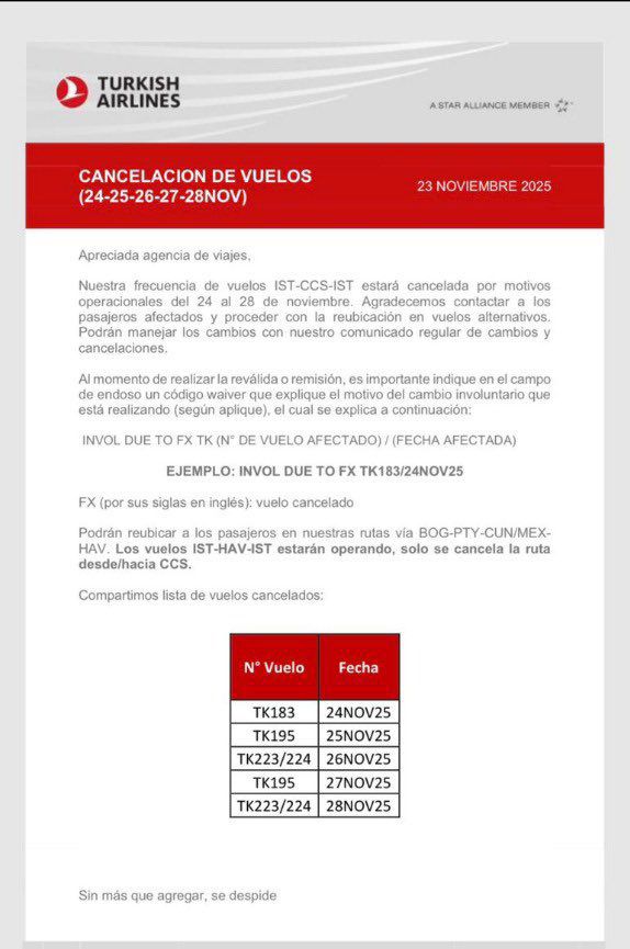 «Nuestra frecuencia de vuelos Estambul-Caracas-Estambul estará cancelada por motivos operacionales del 24 al 28 de noviembre. Agradecemos contactar a los pasajeros afectados y proceder con la reubicación en vuelos alternativos. Podrán manejar los cambios con nuestro comunicado regular de cambios y cancelaciones», señaló Turkish Airlines.