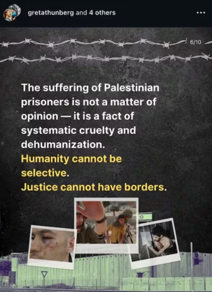 Thunberg, una defensora de la causa palestina, hizo la publicación hace par de días en su cuenta de Instagram. La activista denunció la situación de unos 11.000 prisioneros palestinos y publicó varias fotografías.