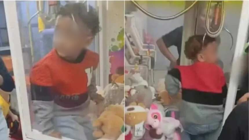 EN VIDEO: Salió a cenar con sus padres a una pizzería y terminó atrapado en una máquina de peluches