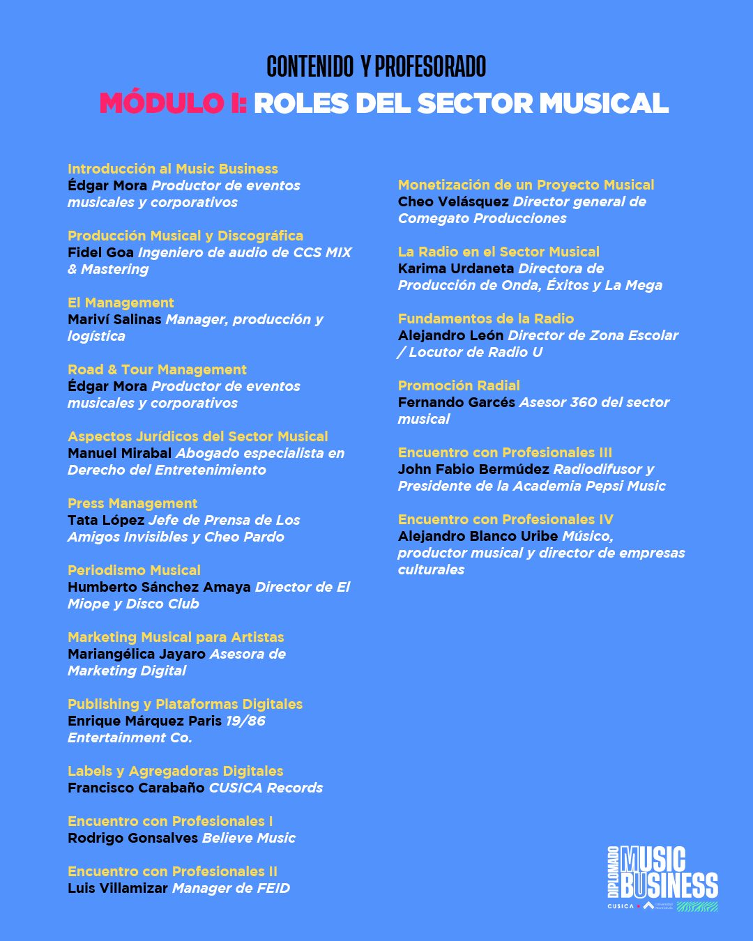 El contenido del Diplomado de Music Business va dirigido a aquellas personas que deseen ejercer en la escena musical. El programa consta de un primer módulo llamado Roles del Sector Musical en el que se estudian las distintas funciones y cargos que existen para el desarrollo de la carrera de artistas y proyectos musicales.