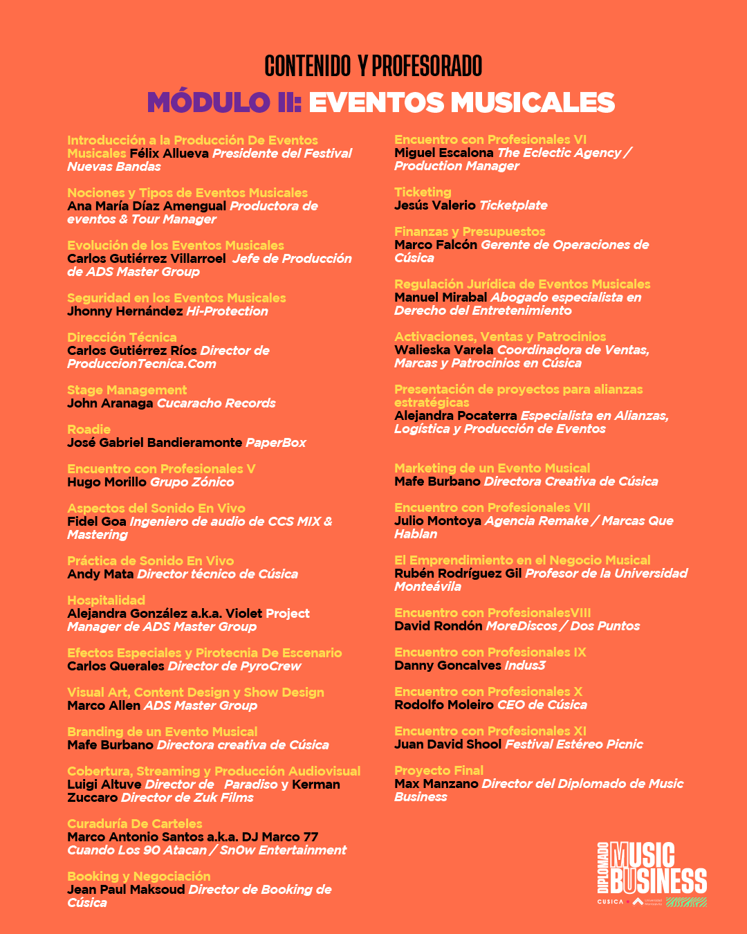 Un segundo módulo dedicado exclusivamente a la promoción y producción de eventos musicales. Una vez aprobados los dos módulos, cada estudiante recibirá un certificado con el sello de la Universidad Monteávila y Cúsica.