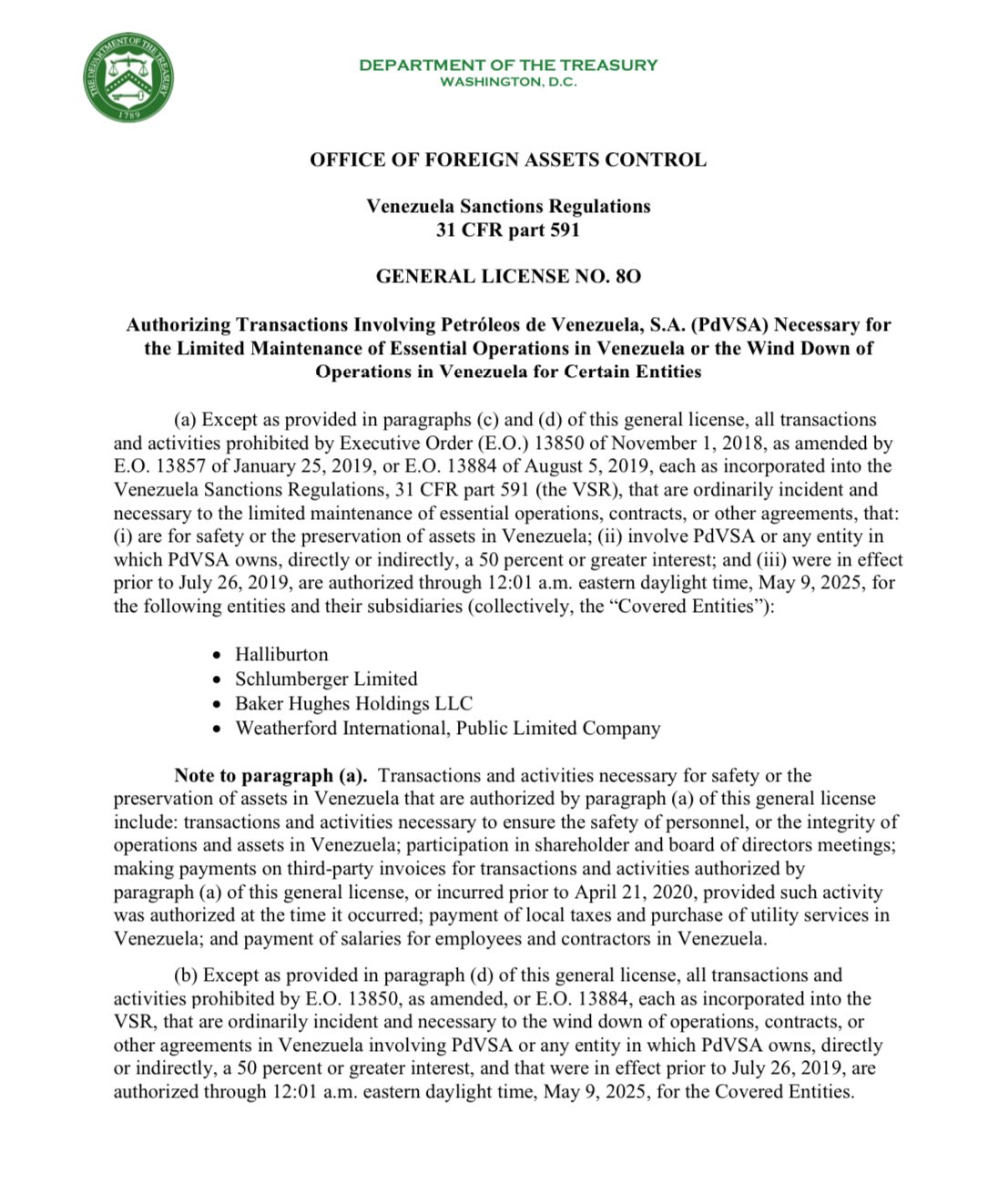 Las transacciones y actividades necesarias para la seguridad o la preservación de activos en Venezuela incluían: «Transacciones y actividades necesarias para garantizar la seguridad del personal o la integridad de las operaciones y los activos en Venezuela, participación en reuniones de accionistas y de la junta directiva, realización de pagos de facturas de terceros por transacciones y actividades autorizadas, o incurridas antes del 21 de abril de 2020, siempre que dicha actividad estuviera autorizada en el momento en que ocurrió, pago de impuestos locales y compra de servicios públicos en Venezuela; y pago de salarios de empleados y contratistas en Venezuela», explicó el texto.