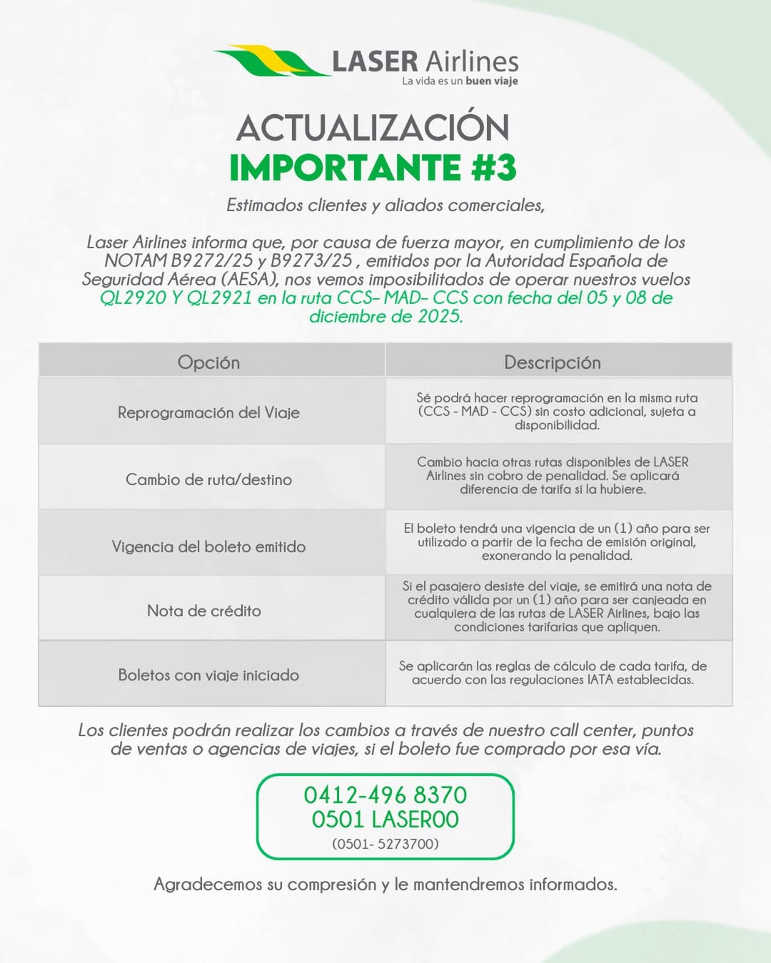 «En cumplimiento de los NOTAM (avisos en el argot aeronáutico) B9272/25 y B9273/25 emitidos por la Autoridad Española de Seguridad Aérea (AESA), nos vemos imposibilitados de operar nuestros vuelos QL2920 y QL2921 CCS-MAD-CCS con fecha del 5 y 8 de diciembre de 2025», precisó Laser en un comunicado actualizado en Instagram.