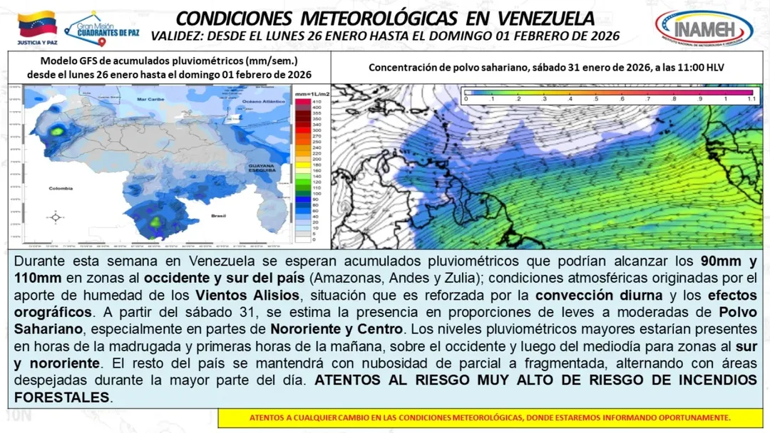 Finalmente, señaló que aunque gran parte del país alternará entre cielos parcialmente nublados y áreas despejadas durante el día, la llegada de polvo sahariano a partir del sábado, 31 de enero,  podría reducir la humedad atmosférica.