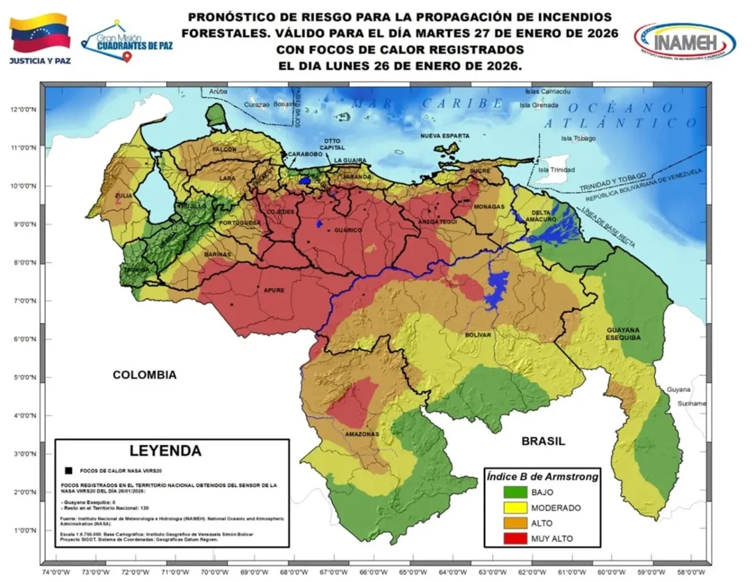 El organismo publicó un mapa de riesgo de propagación de incendios donde revelaron los estados con mayor riesgo. La lista está conformada por los estados Guárico, Apure, Barinas, Cojedes, Portuguesa y parte de Anzoátegui.