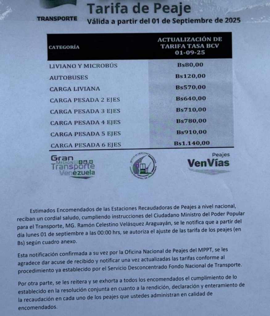 En caso de oficializarse, este sería el tercer aumento del precio del peaje en lo que va de 2025. A principio de año los conductores pasaron de pagar 15 a 30 bolívares. Posteriormente, el pasado mes de agosto el monto mínimo pasó de 30 a 75 bolívares.
