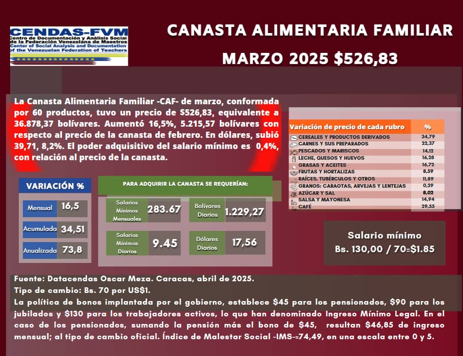 El Centro de Documentación y Análisis de la Federación Venezolana de Maestros (Cendas-FVM) reveló en su más reciente informe que para el mes de marzo un venezolano necesitó 105,3 dólares solo para adquirir sus productos de la canasta alimentaria, lo que representa un aumento de 7,9 dólares respecto a febrero.