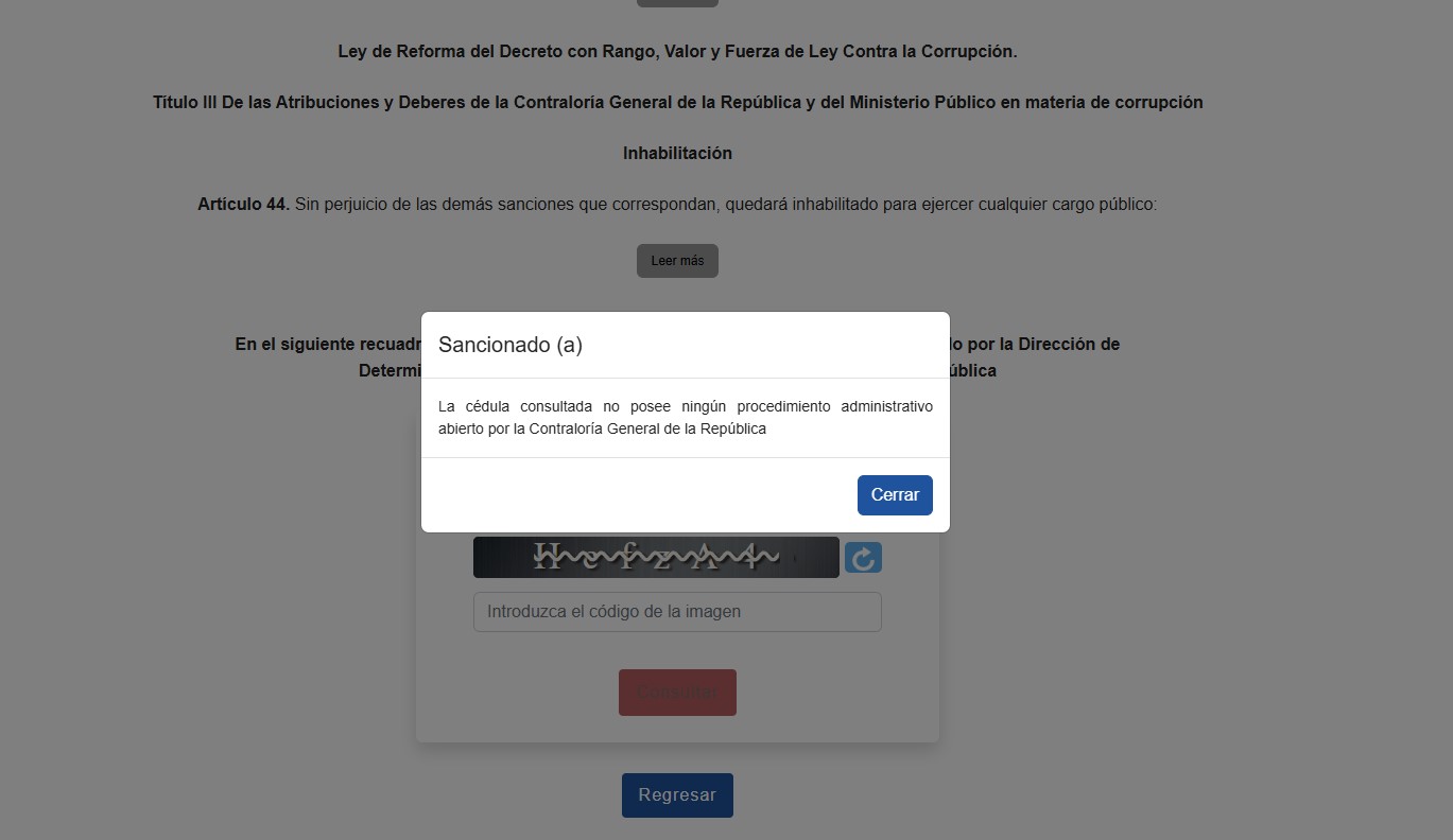 Al colocar sus respectivos números de cédulas la web de sanciones de la Contraloría General arroja el siguiente mensaje: «La cédula consultada no posee ningún procedimiento administrativo abierto por la Contraloría General de la República».