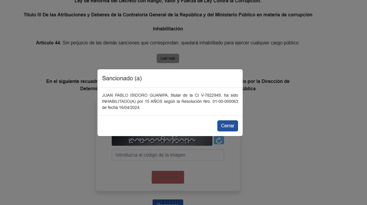 En un principio pudiera pensarse de que se trata de un error de la web. Sin embargo, al introducir el número de cédula de Juan Pablo Guanipa, aparece un mensaje diferente. «Ha sido INHABILITADO(A) por 15 años, según la Resolución Nro. 01-00-000063 de fecha 16/04/2024».