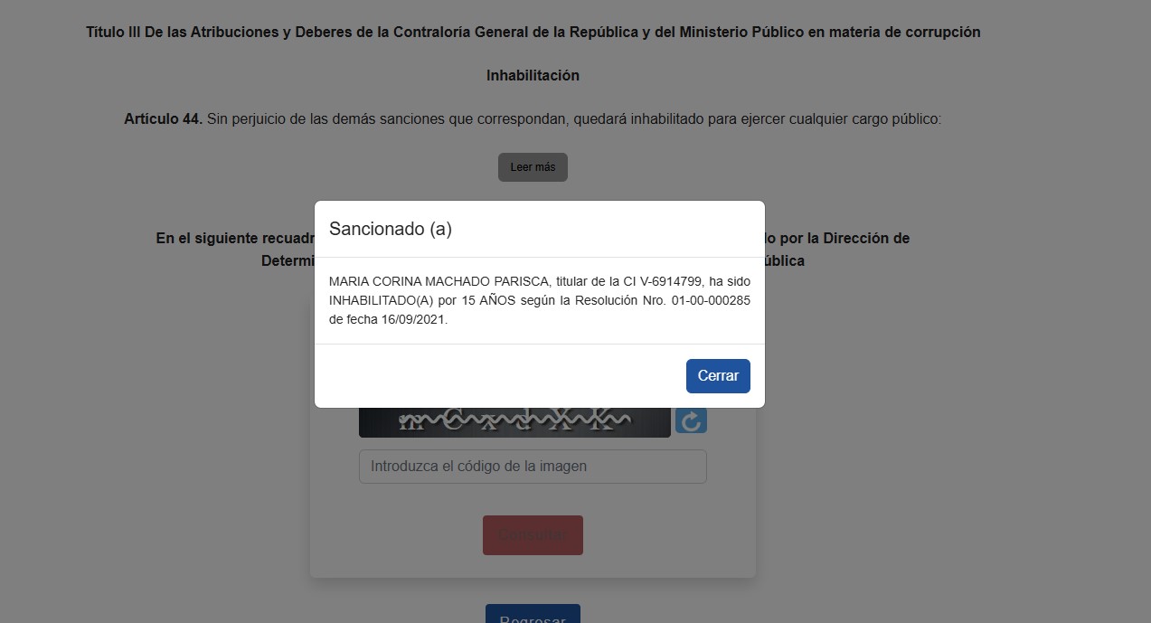 Lo mismo ocurre con la líder de la oposición, María Corina Machado, quien aparece como inhabilitada para cargos públicos. «Ha sido INHABILITADO(A) por 15 años, según la Resolución Nro. 01-00-000285 de fecha 16/09/2021».