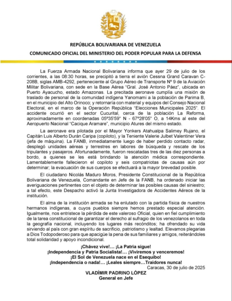 «La aeronave cumplía una misión de traslado de personal de la comunidad indígena Yanomami a la población de Parima B, en el municipio del Alto Orinoco. Y retornaría con material y equipos del Consejo Nacional Electoral, en el marco de la Operación República ‘Elecciones Municipales 2025′», señaló Padrino López.