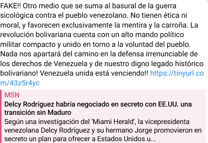 «Fake. Otro medio que se suma al basural de la guerra psicológica contra el pueblo venezolano. No tienen ética ni moral, y favorecen exclusivamente la mentira y la carroña», comentó.