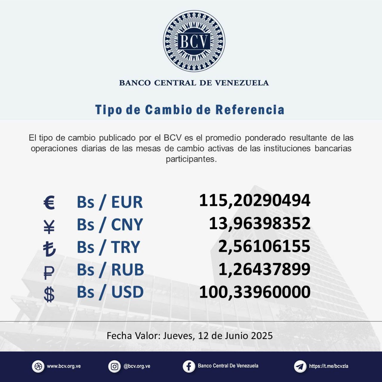 El ente emisor publicó esta tarde el tipo de cambio de referencia para este jueves, 12 de junio. En ese sentido, el BCV precisó que el dólar llegó a un valor de 100,33 bolívares, mientras que el euro se ubicó en 115,20 bolívares.