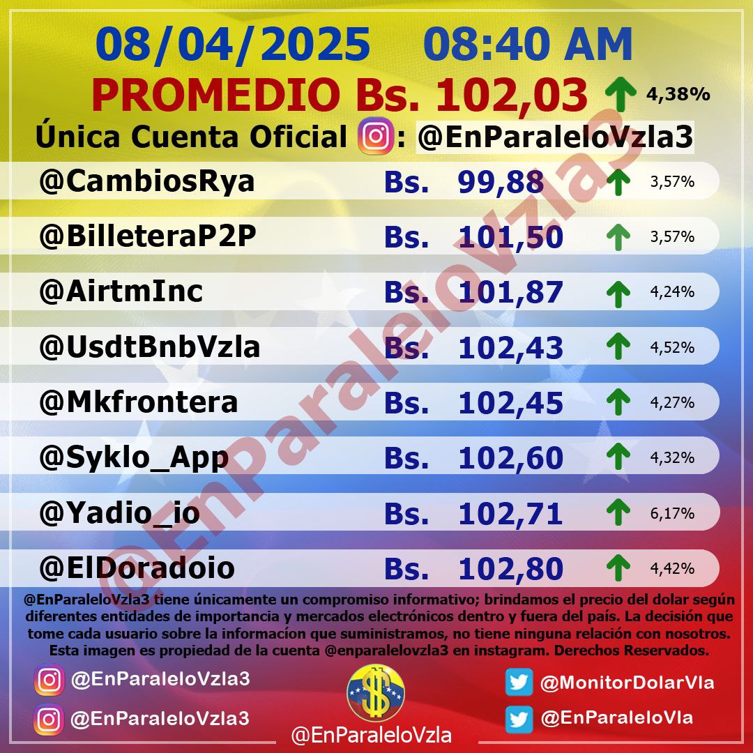 El dólar paralelo inició la jornada de este 8 de abril con tendencia alcista al cotizarse en Bs. 102,03.