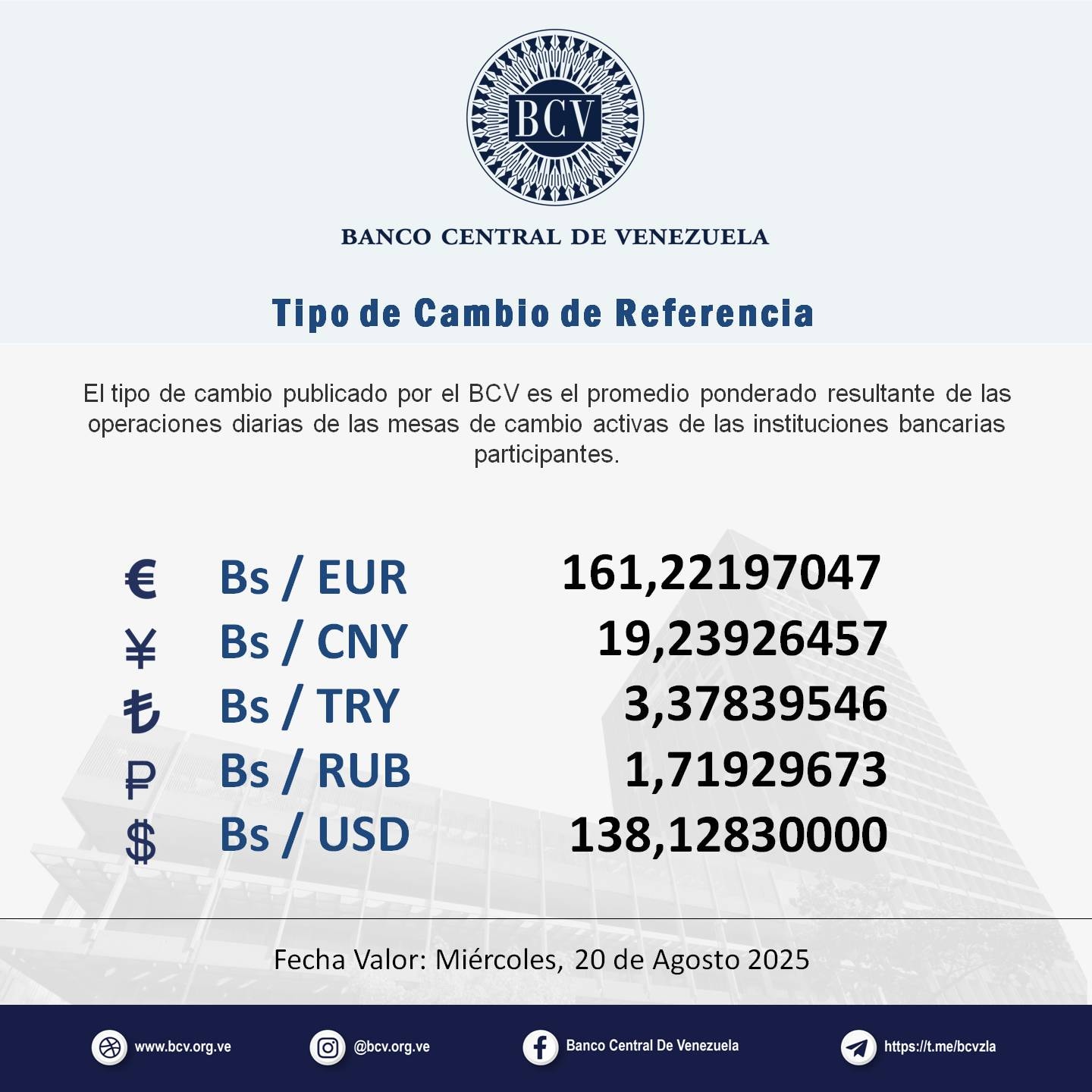 El tipo de cambio publicado por el BCV es el promedio ponderado resultante de las operaciones diarias de las mesas de cambio activas de las instituciones bancarias participantes», acotó el ente emisor.
