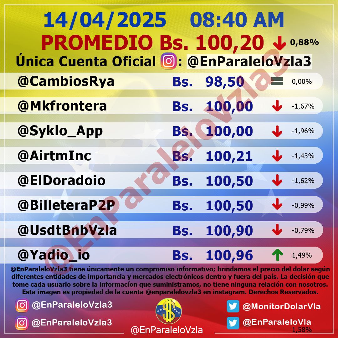El dólar paralelo inició la jornada de este 14 de abril con tendencia a la baja al cotizarse en Bs. 100,20.