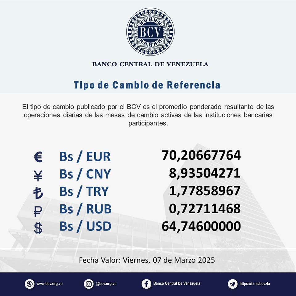 Entre tanto, el tipo de cambio oficial reportado por el Banco Central de Venezuela (BCV), se ubica para este viernes en Bs. 64,75. Además el euro tiene un valor de Bs. 70,21.
