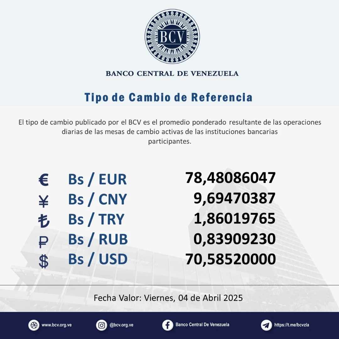 Entre tanto, el tipo de cambio oficial reportado por el Banco Central de Venezuela (BCV), se ubica para este viernes en Bs. 70,59. Además el euro tiene un valor de Bs. 78,48.