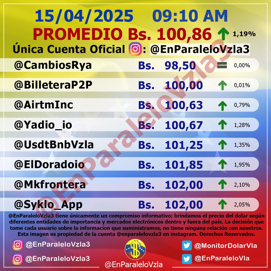 El dólar paralelo inició la jornada de este 15 de abril con tendencia alcista al cotizarse en Bs. 100,86.