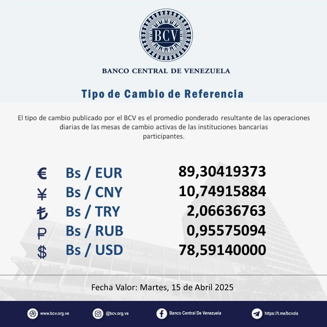 Entre tanto, el tipo de cambio oficial reportado por el Banco Central de Venezuela (BCV), se ubica para este martes en Bs. 78,59. Además el euro tiene un valor de Bs. 89,30.