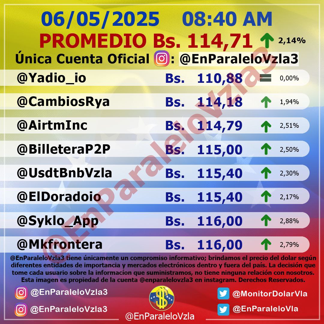 El dólar paralelo inició la jornada de este 6 de mayo con tendencia alcista al cotizarse en Bs. 114,71.